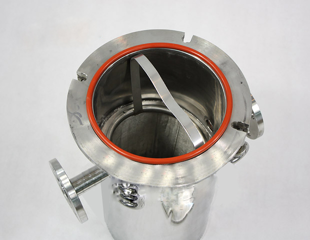 籃式過濾器主要由接管、主管、濾藍、法蘭、法蘭蓋及緊固件等組成。當液體通過主管進入濾藍后,固體雜質顆粒被阻擋在濾藍內,而潔凈的流體通過濾籃、由過濾器出口排出。當需要清洗時,旋開主管底部螺塞,排凈流體,拆卸法蘭蓋,清洗后重新裝入即可。因此,使用維護極為方便。
